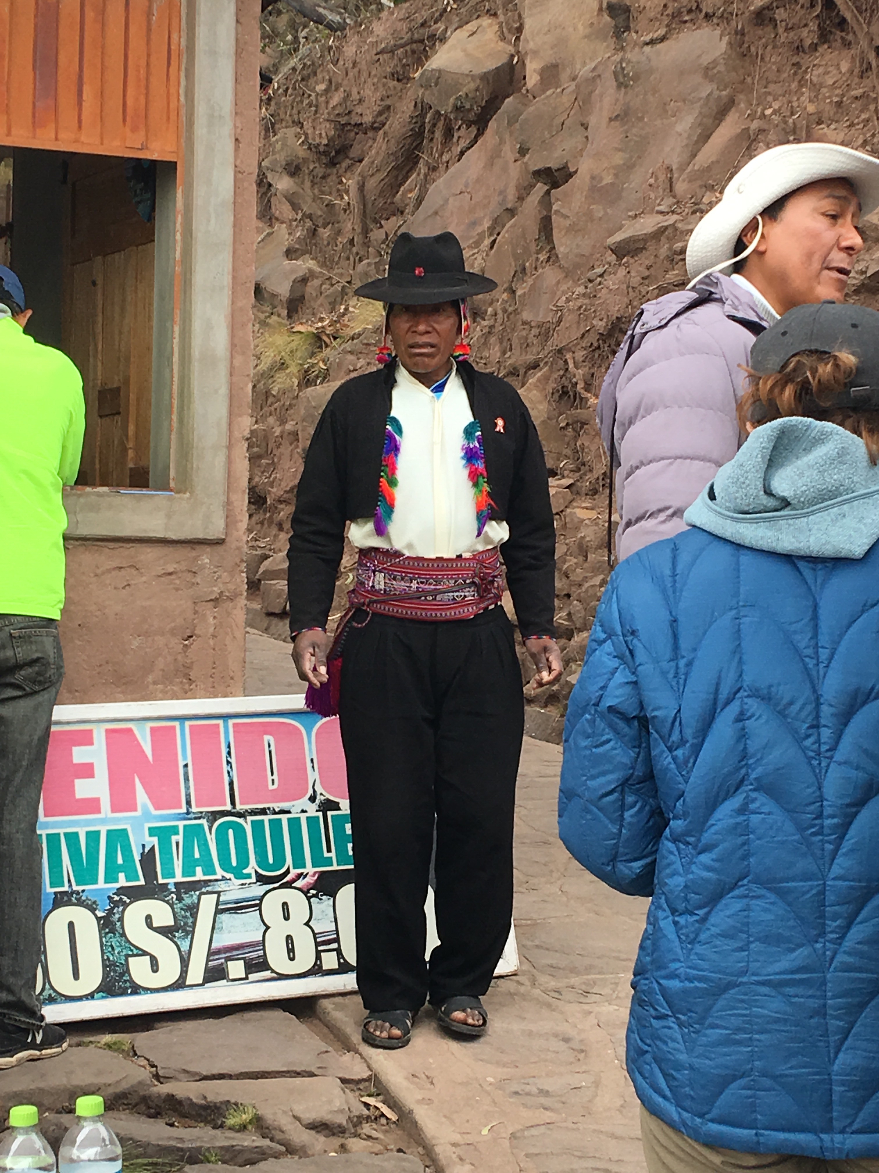 We took a short boat ride over to the island of Taquile. Our day would be spent walking around the island seeing and experiencing local culture. One of the local authorities was there to check us into the island. We would learn there are 20 of these men that volunteer to be the officials of the island. Each day they walk around taking to the members of the community to see if everything is ok. There are no police or firearms but they do carry whips.