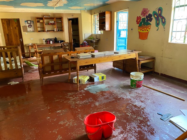 Today, we got a lot of work done on the floor. Mr. Tom continued to lay tile as I grouted the parts that were complete. Since this is the room that 7 babies, 3 toddlers spend most of their time we are strategically trying to figure out how to work on what sections so the Aunties and babies can get back and forth to the cribs and bathrooms. There might be some nighttime tiling in our future. The best part of the day was when the kids came into the room to check out the new floor – so full of life.