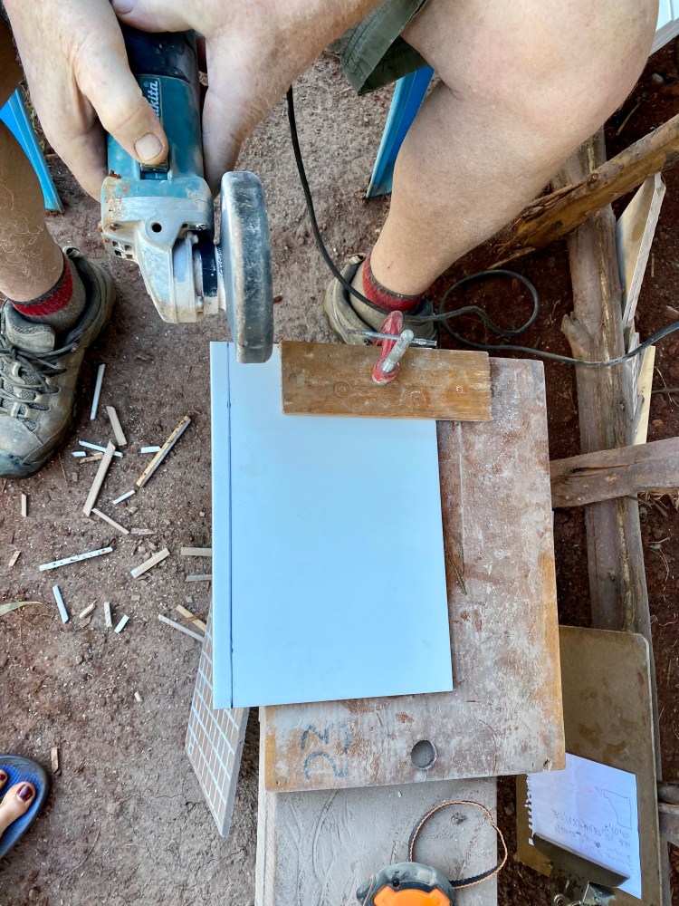 When we last left he was trying to figure out a way to cut the tile without a wet saw. He found a grinder with an all purpose blade and works like a charm.