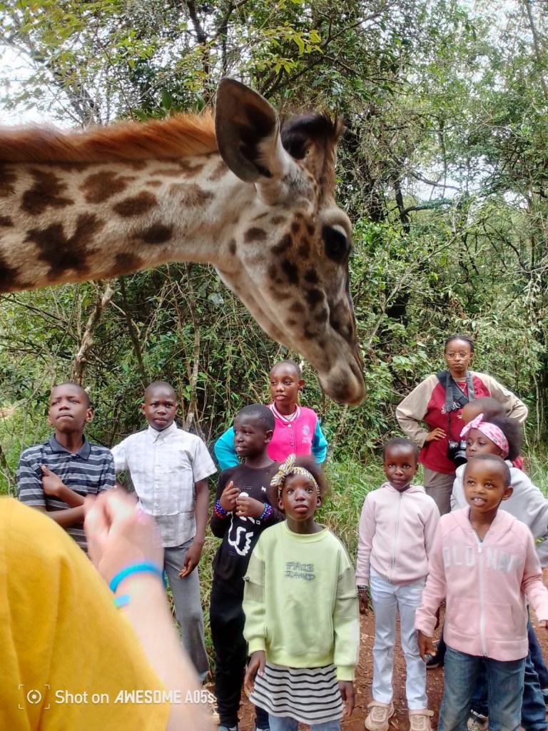 We took the first group on their first bus ride to the https://www.kws.go.ke/nairobi-animal-orphanage. It was fabulous able to see the animals up close. The children – and I were able to feed, pet and get up close and personal with Edward the Giraffe.