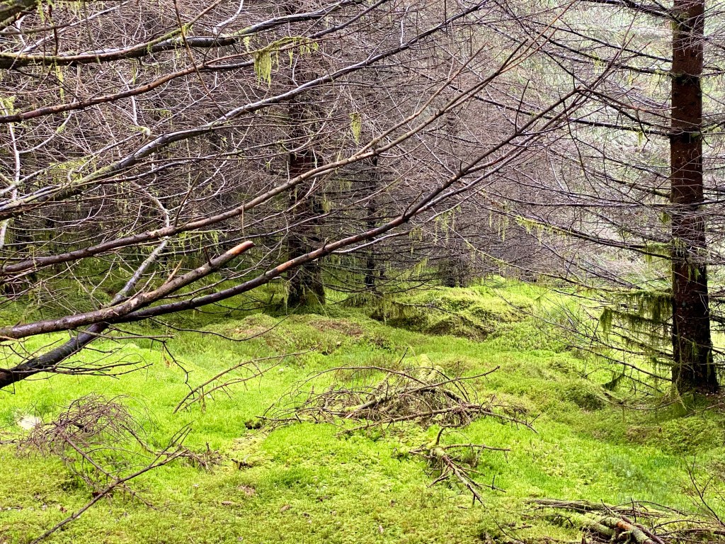 The next half of the hike started as we entered a very thick conifer plantation. I learned that Scotland did not have any trees because of the quality of the soil for over 3000 years. Conifers are planted since they can thrive in the thin soil and later used for energy – meaning less reliance on foreign sources. You can see in the above picture areas of these trees.