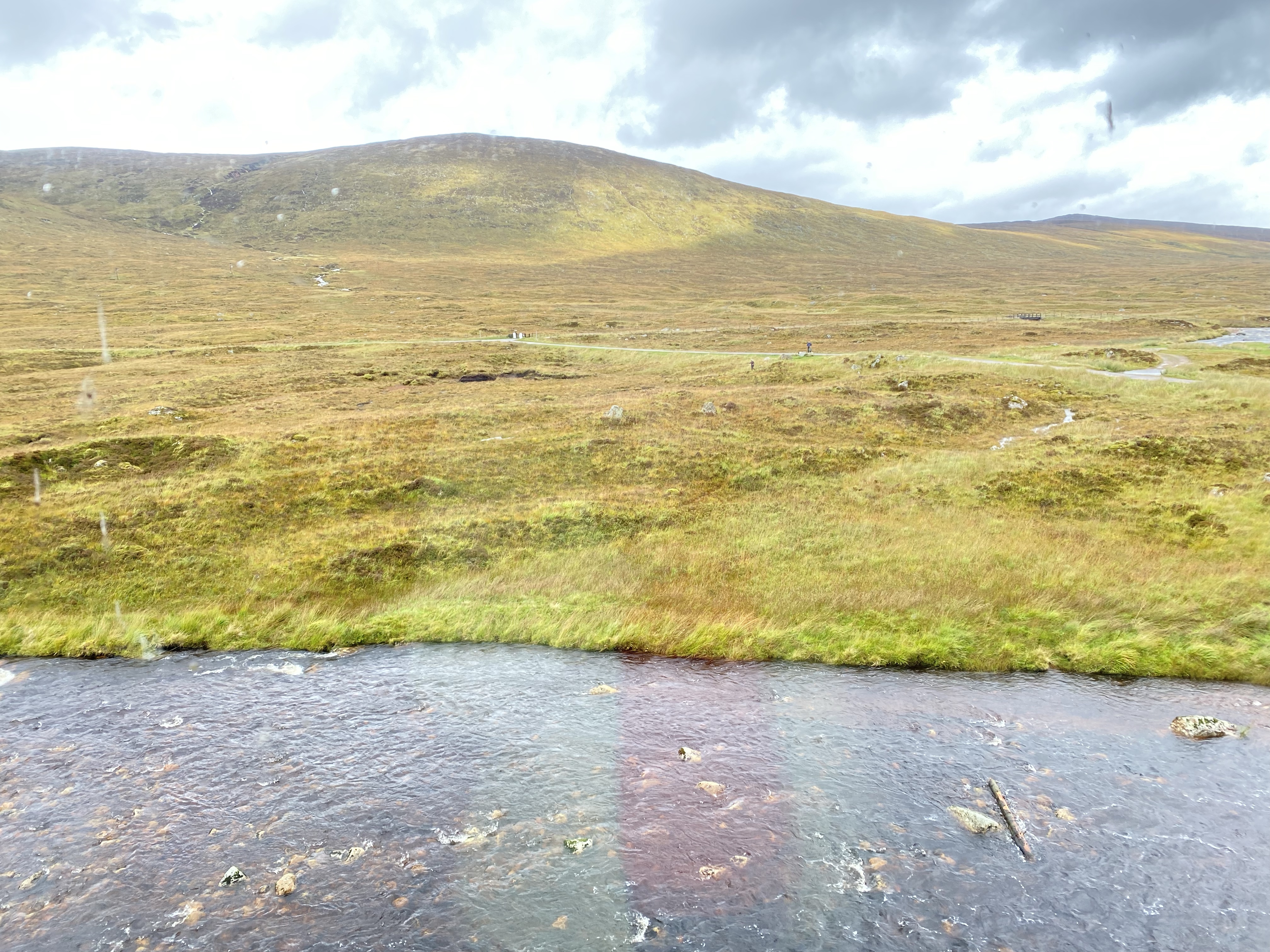 Today took us on old military roads (constructed in the Scottish during the middle part of the 18th century as part of an attempt by the British Government to bring order to a part of the country which had risen up in the Jacobite rebellion of 1715) through the Rannoch Moor – 50 square miles of boggy moor. It started out pouring rain and then: