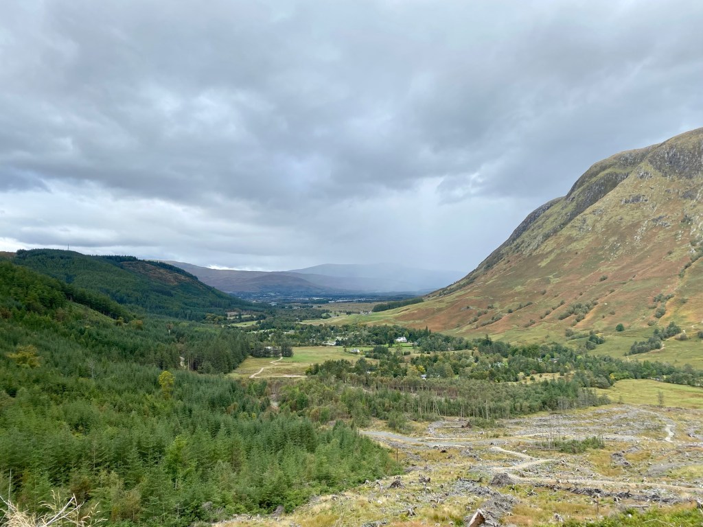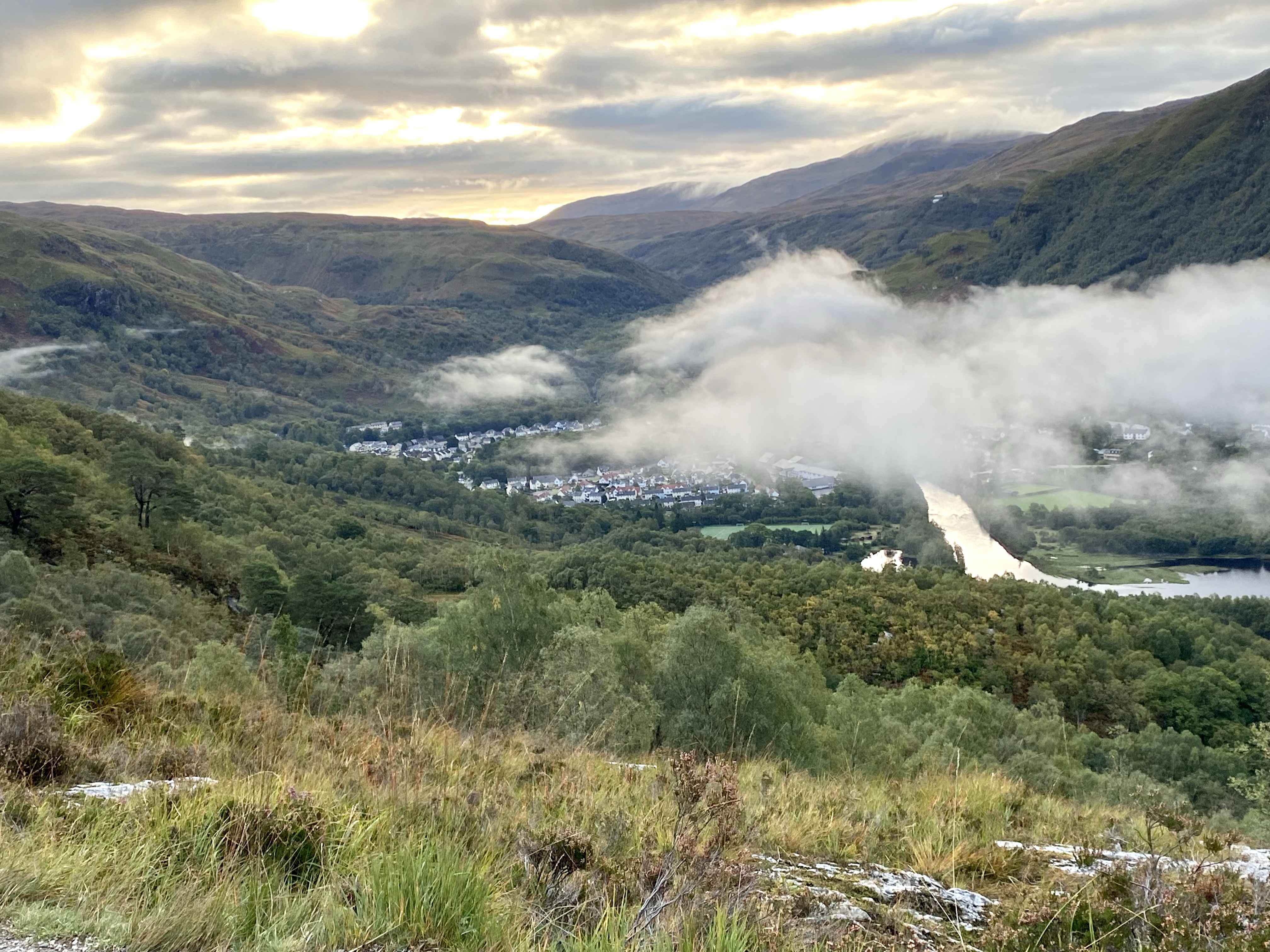 After another wonderful breakfast we headed off to Kinlochleven on a trail promising spectacular views. It didn’t start out that way…..here is what we were supposed to see at the start and what we saw.